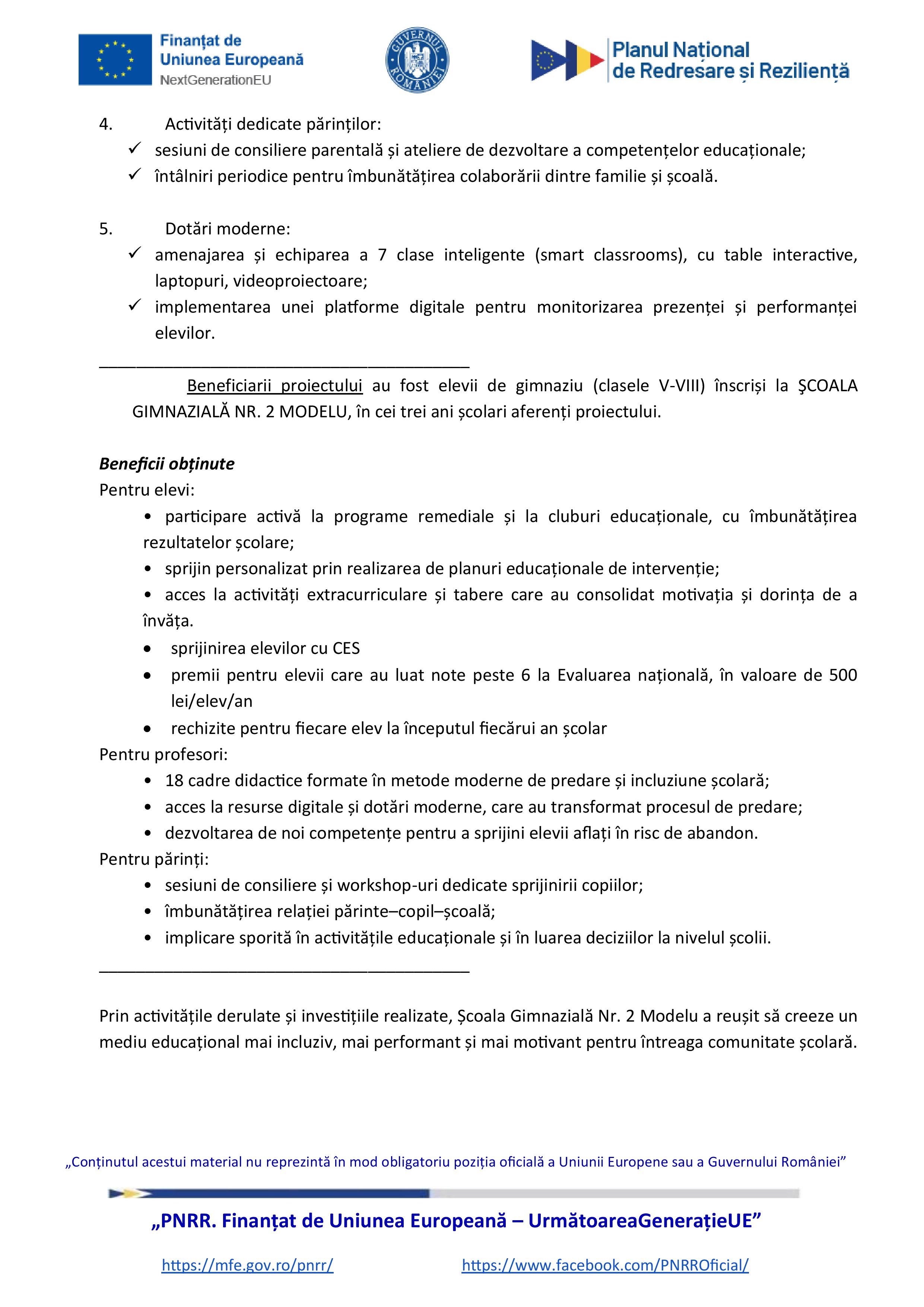 Prin activitățile derulate și investițiile realizate, Școala Gimnazială Nr. 2 Modelu a reușit să creeze un mediu educațional mai incluziv, mai performant și mai motivant pentru întreaga comunitate școlară.